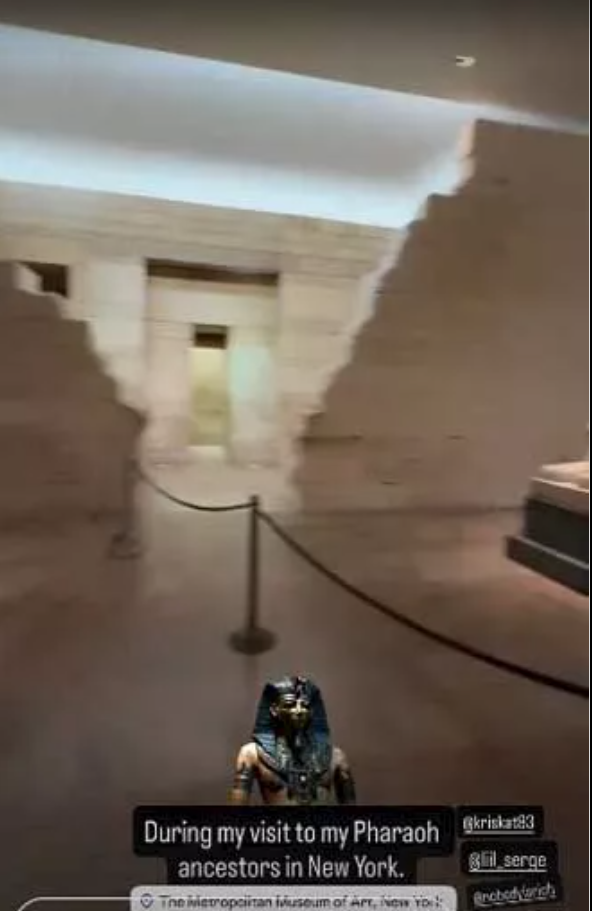 كما تجول الفنان برفقة العمدة في القسم المخصص للحضارة المصرية القديمة، وعلّق على ذلك عبر خاصية “القصص” قائلاً: “خلال زيارتي لأجدادي الفراعنة في نيويورك”.