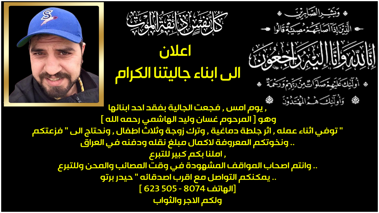 توفي اثناء عمله , اثر جلطة دماغية , وترك زوجة وثلاث اطفال , ونحتاج الى ” فزعتكم ” ونخوتكم المعروفة لاكمال مبلغ نقله ودفنه في العراق .. املنا بكم كبير للتبرع , وانتم اصحاب المواقف المشهودة في وقت المصائب والمحن وللتبرع .. يمكنكم التواصل مع اقرب اصدقائه ” حيدر برتو ..